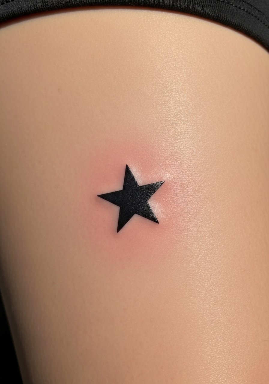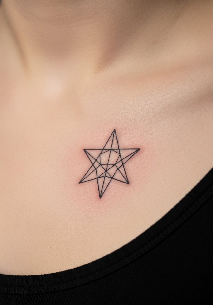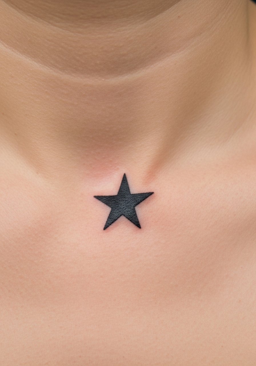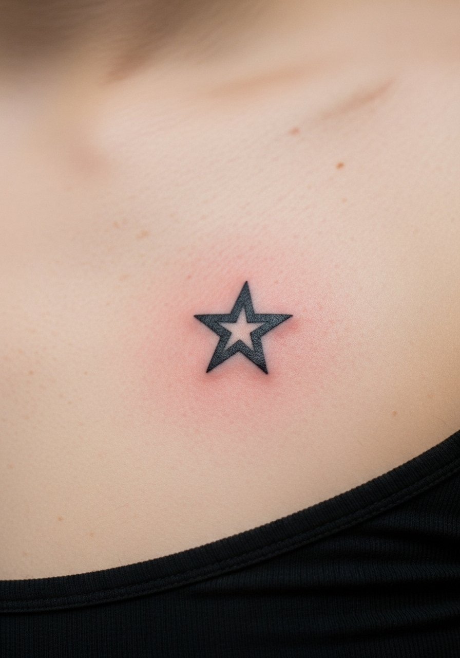 A collarbone star reads classic and directional. The area moves with clothing so expect some tenderness. Healed results look strong with solid black. Avoid ultra-fine points too close to bone—lines can blur where skin is thin.