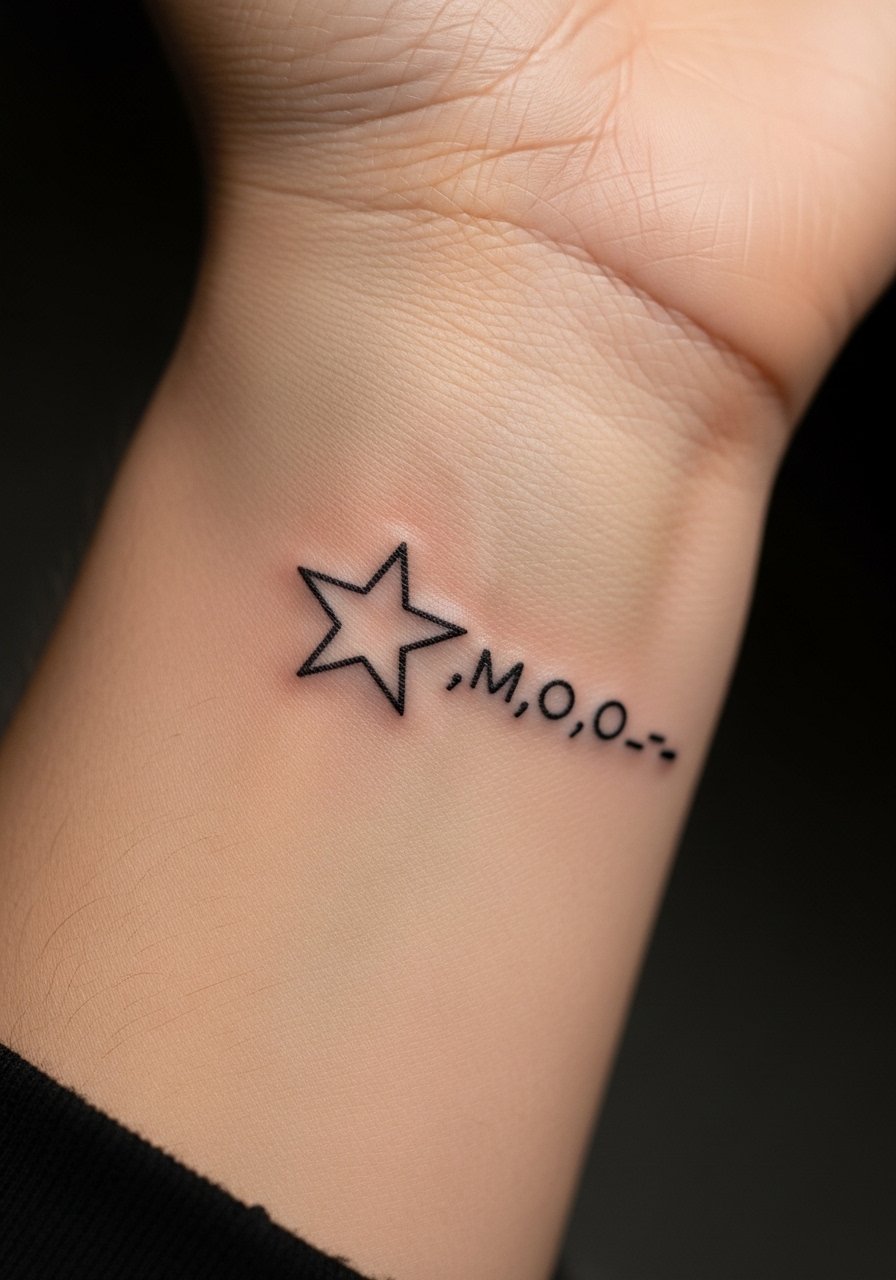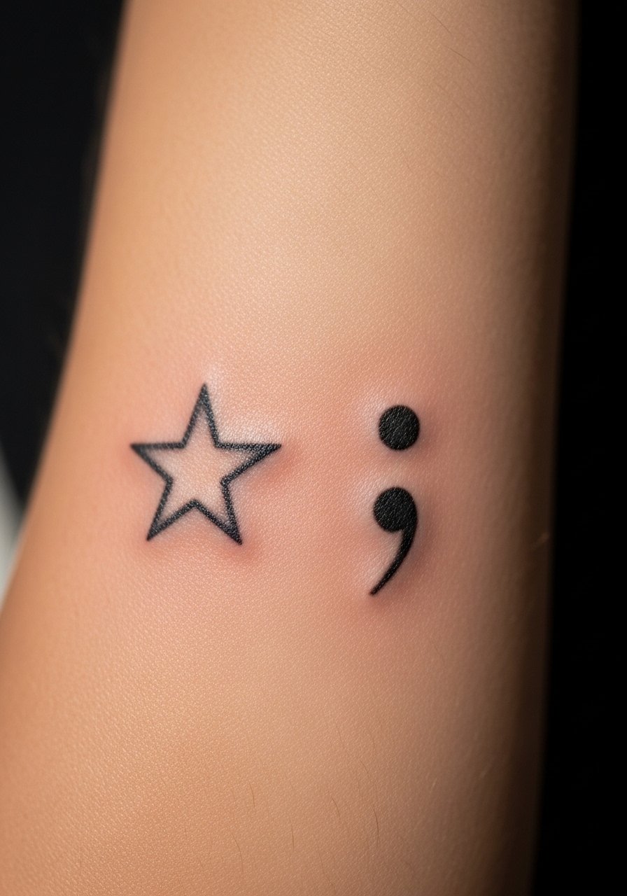 Pairing a star with a semicolon creates quiet symbolism. It’s simple to execute and heals well on the inner arm. Expect low pain and straightforward aftercare. Ask to see healed black ink examples.
