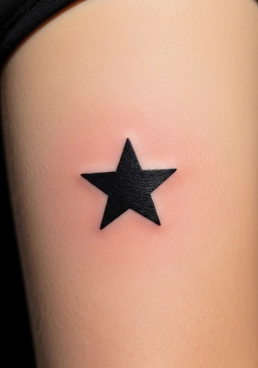 A filled star holds its form. The tricep is low-pain and ages predictably. Solid black resists fading. Avoid tiny filled shapes that can blur—keep it simple.
