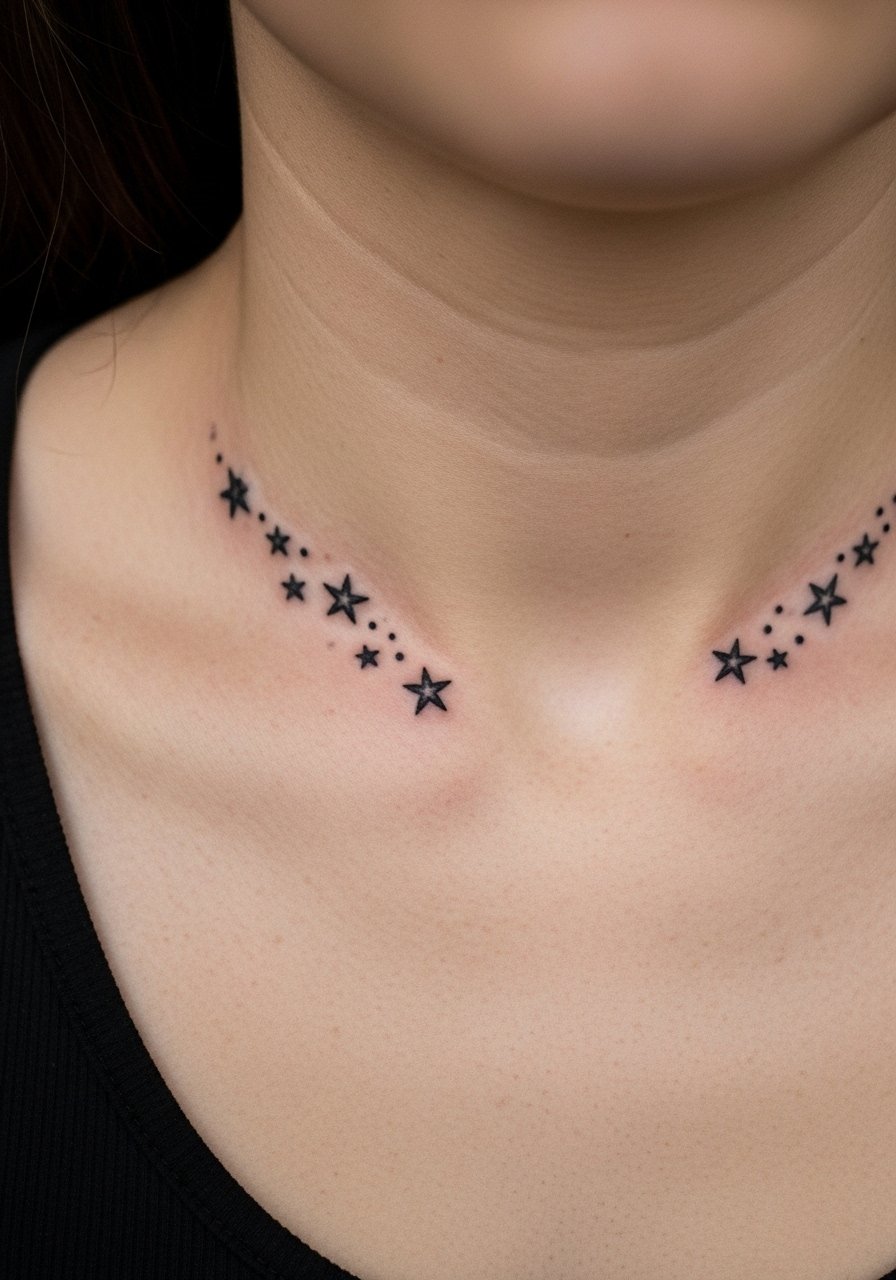 Clusters across the collarbone catch light and move with clothing. Spacing matters to prevent merging as skin ages. This placement photographs well healed.