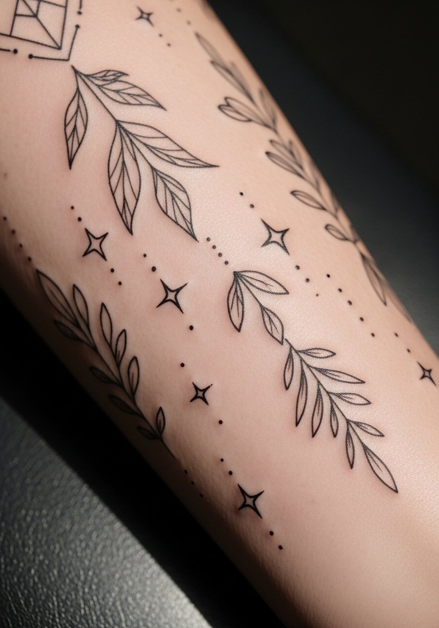 Style/Technique: Minimalist Linework | Pain Level: Variable | Session Time: Multiple short sessions | Best For: Sleeve integration