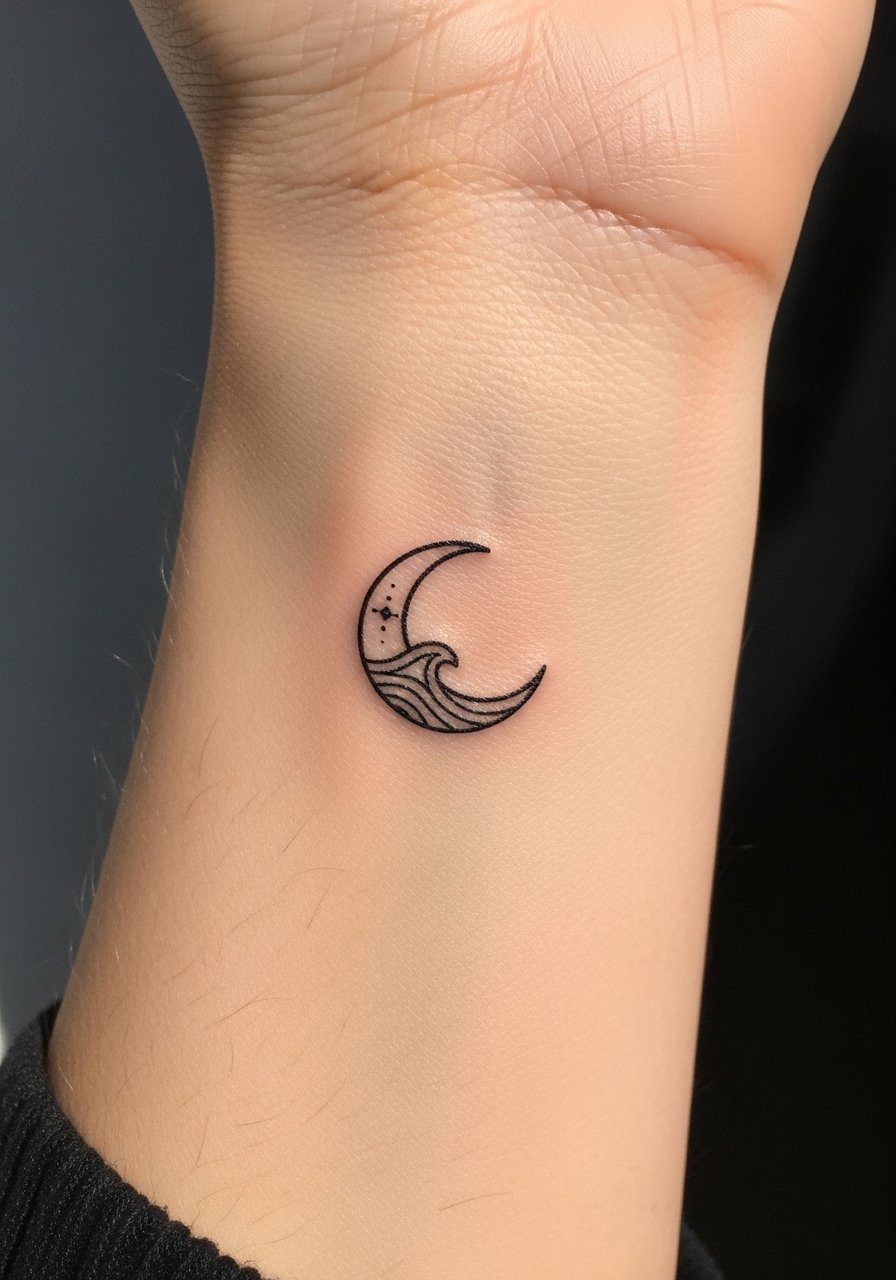 Pairing a crescent moon with a wave gives a calm-versus-motion story. I like this as a daily reminder of balance. Healing is straightforward; avoid heavy wrist flexing while it scabs. For richer contrast, ask your artist to strengthen key anchor lines.