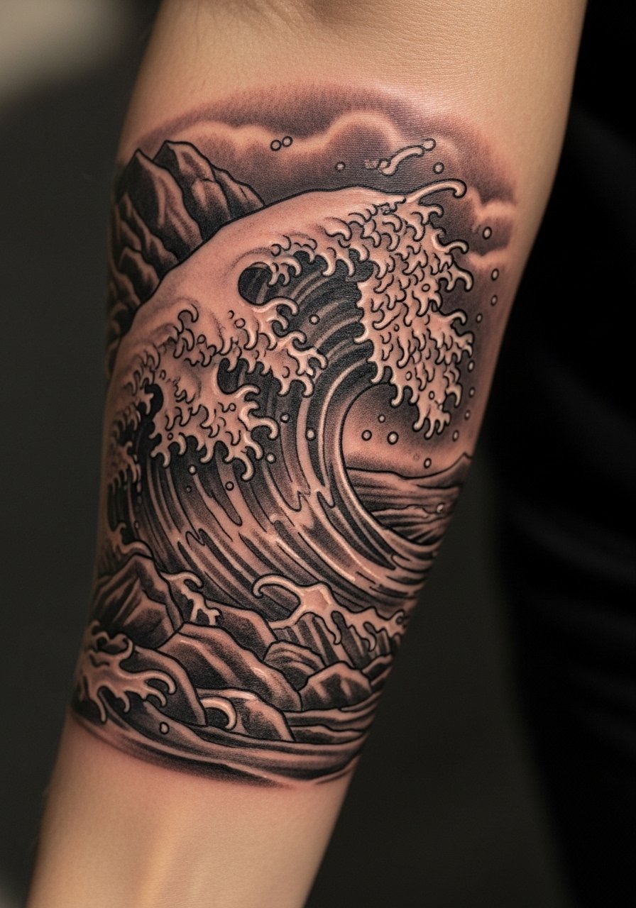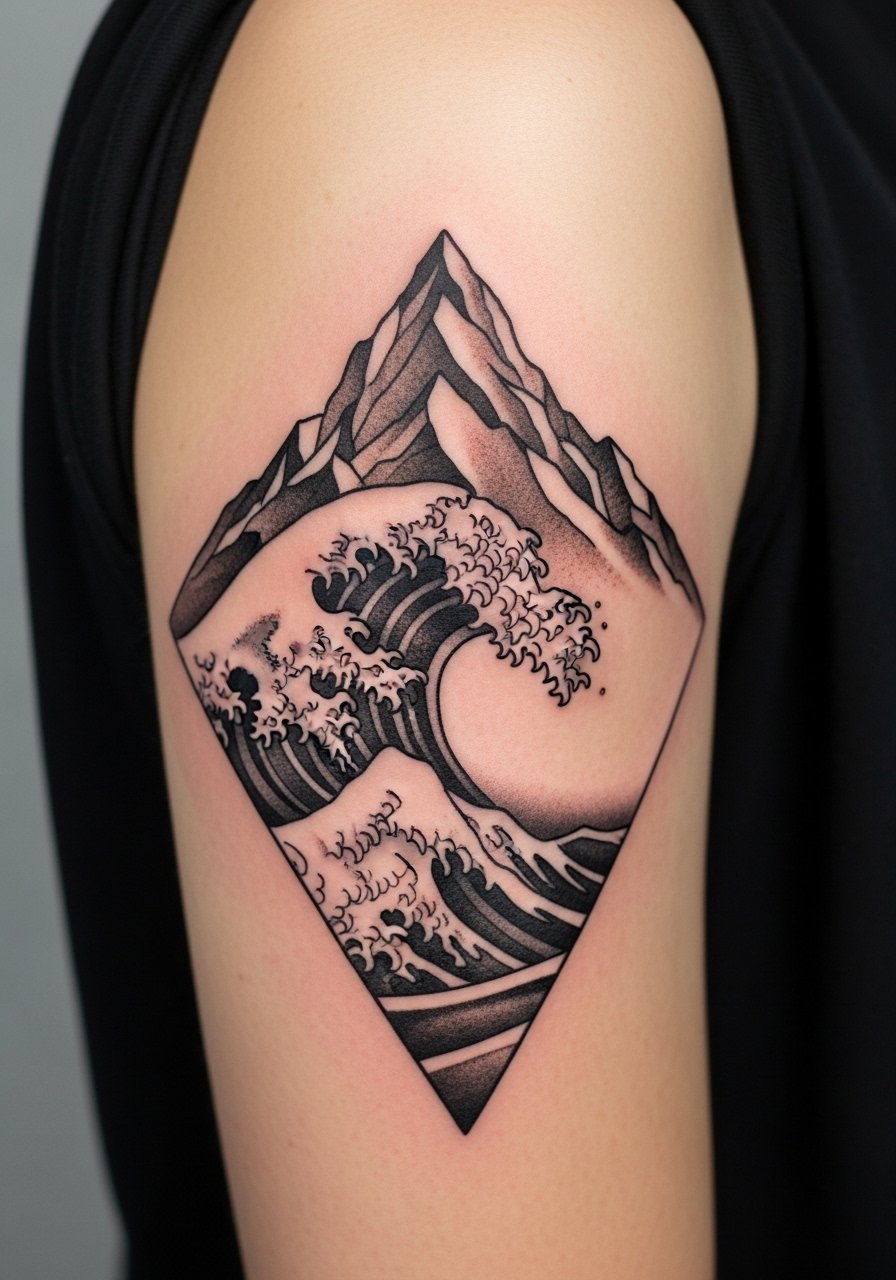This combo reads as balance — I chose it to mark a life pivot. Upper arm placement is forgiving for detail and less painful than ribs. Ask for clear separation between elements so the mountain doesn’t blur into the wave over time.