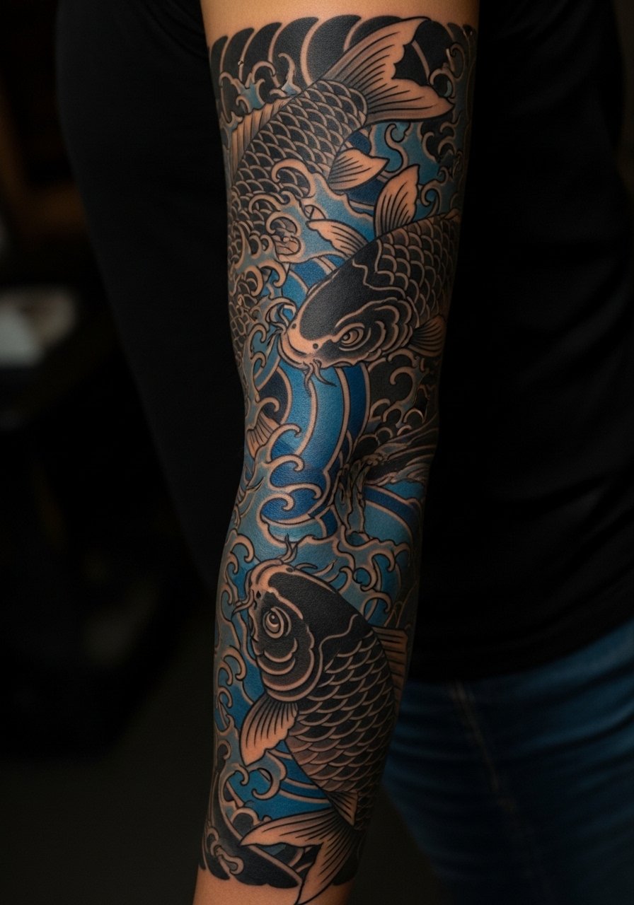 Waves as filler tie sleeves together. I’ve seen sleeves where waves elevate the whole story. Tell your artist what motifs you want linked — good flow demands planning and a steady shading approach for longevity.