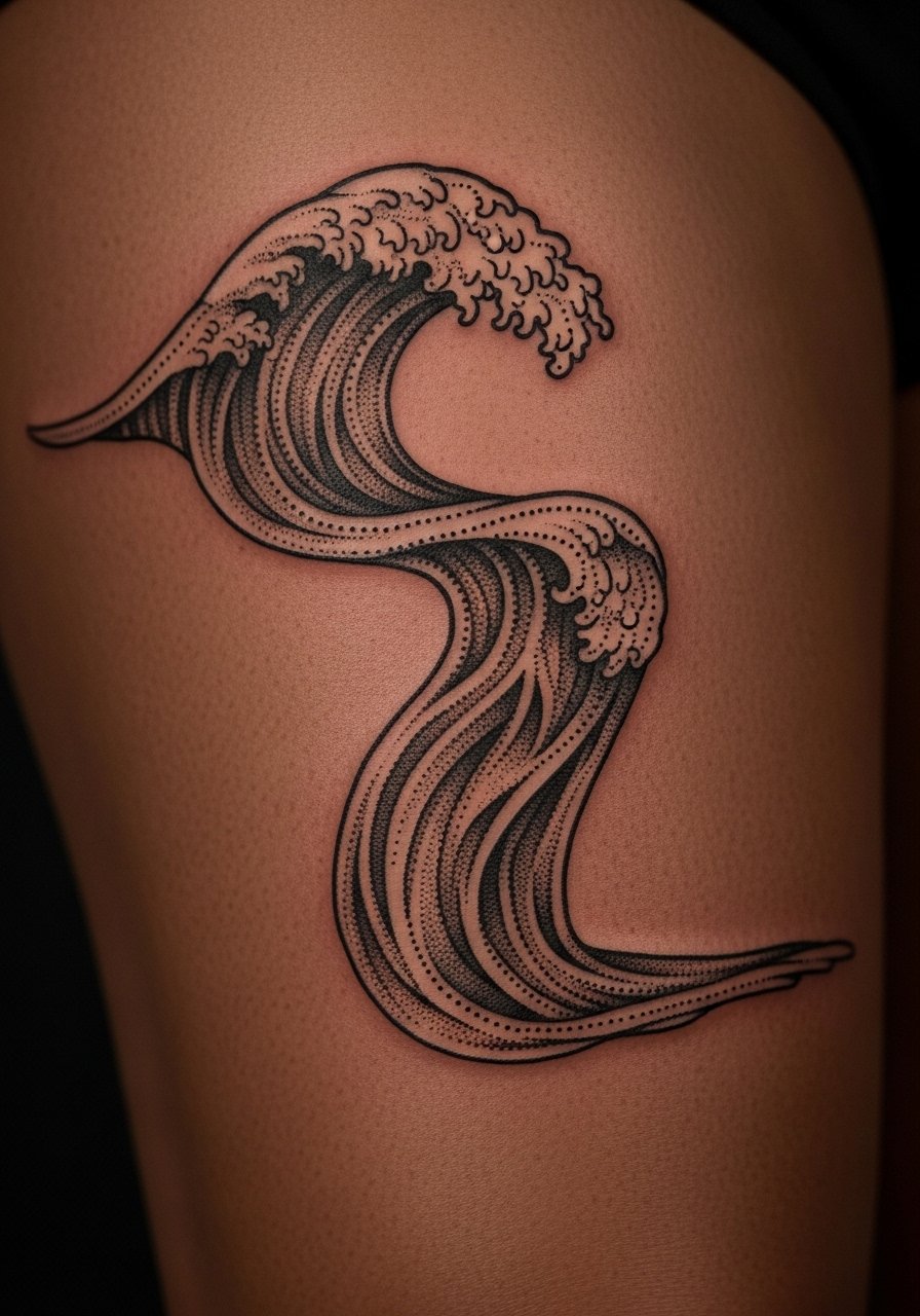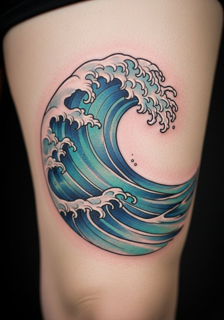 Surrealist waves let an artist interpret storylines. I worked with an artist who used Procreate mocks to refine composition. Thigh canvas gives room for details that heal well when moisturized and sun-protected.