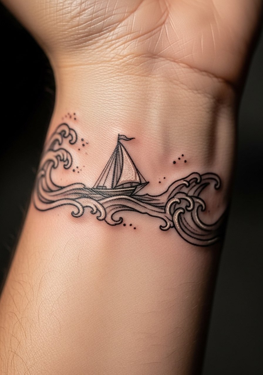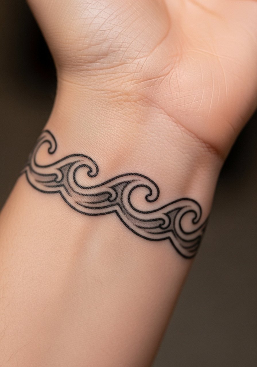 Bands feel symbolic and rhythmic. I chose a subtle continuous wave as a reminder to stay adaptable. Beware wrist movement while healing. A slightly thicker line helps this style hold up better over time.