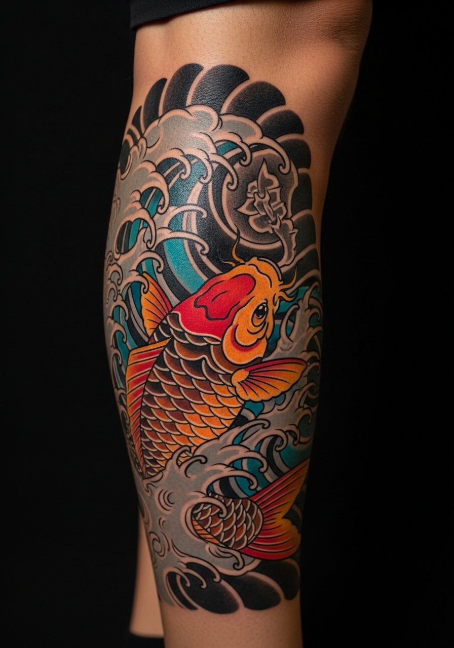 Combining koi and waves creates a narrative of perseverance. I recommended larger, bolder strokes so both elements read clearly as they age. Calf placement is forgiving for touch-ups.