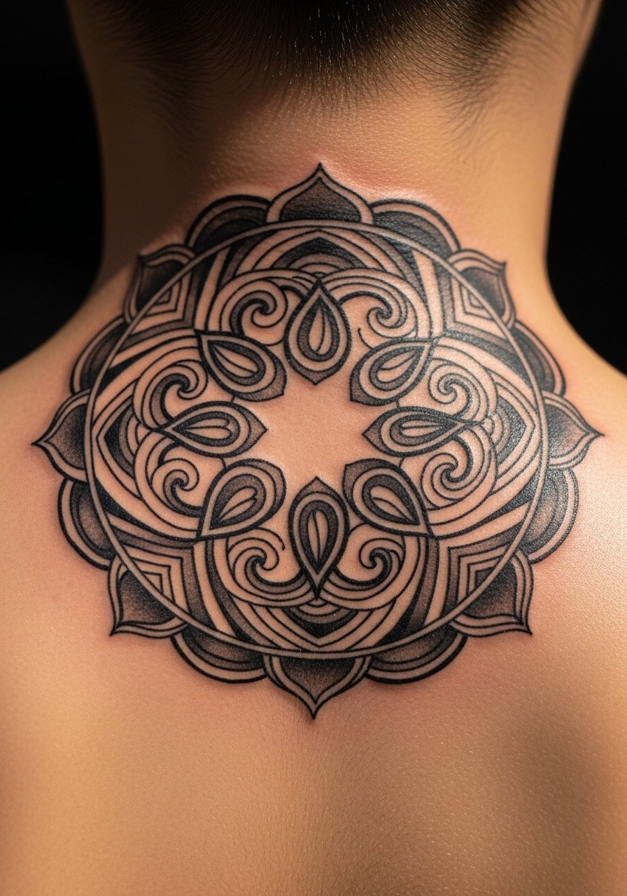 Mixing mandala geometry with wave elements creates a meditative piece. I chose this spot to peek above collars. Keep lines strong and centered; asymmetry shows quickly with movement.