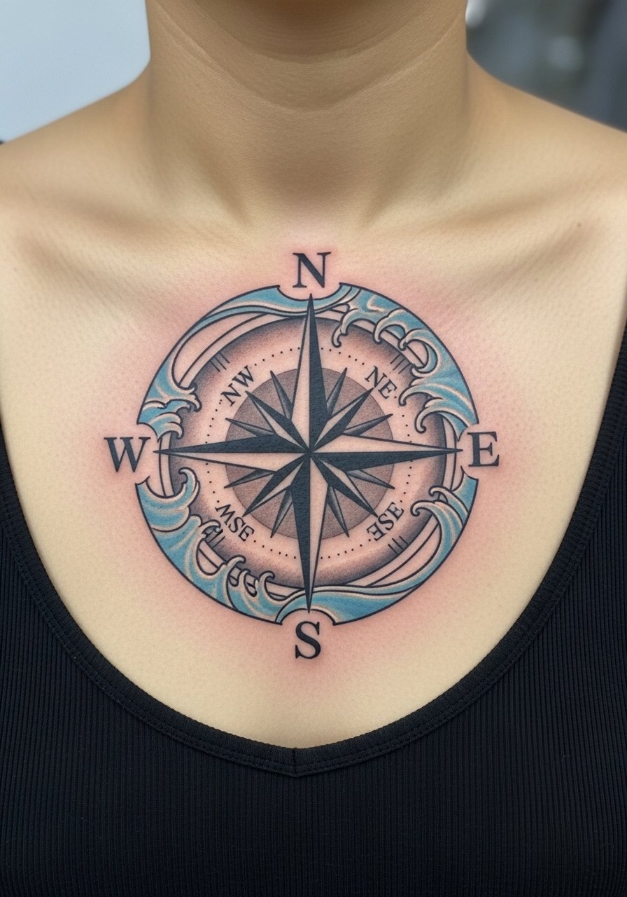 Combining a compass with waves reads like a travel motto. I like how chest placement feels anchored. Keep in mind sun exposure here — sunscreen matters once healed to prevent color drift.