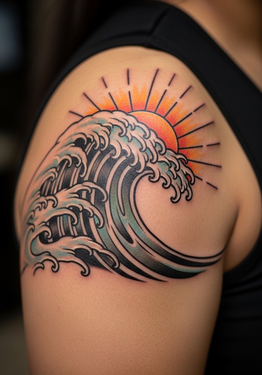 Pairing sun and wave symbolizes cycles for me. Shoulder cap allows this to be visible or covered easily. Ask for saturated pigments and bold outlines so the sunburst keeps contrast as it ages.