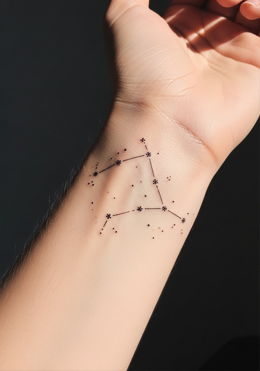 A tiny band of your sun-sign constellation looks personal and discrete. The wrist is low-pain but exposed—expect quicker fading from sun and friction. Fine line heals in 2–4 weeks on the surface; lines can blur if artist overworks the skin. Ask for slightly bolder dots from a fine line artist to help it age. Avoid very faint single-needle lines here.