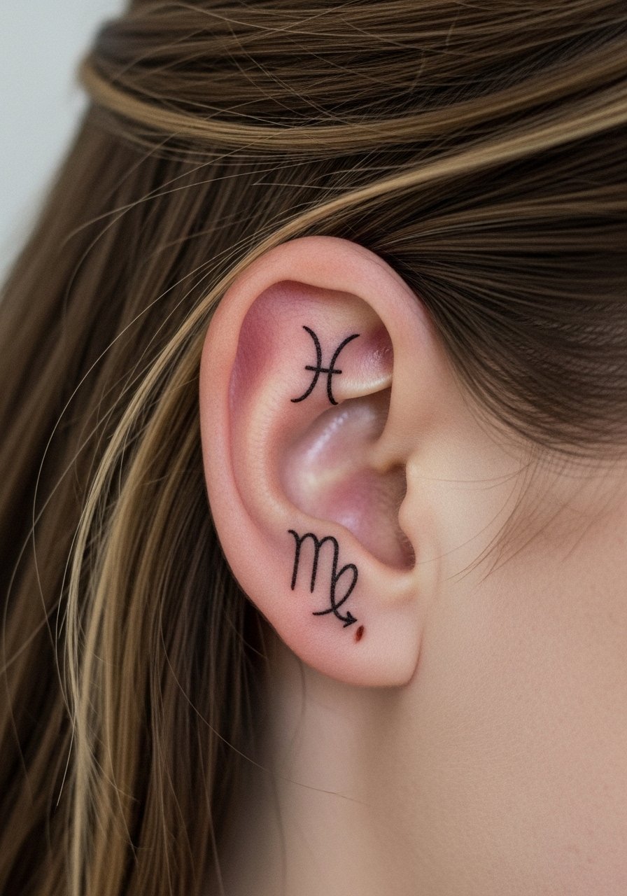 A small glyph behind the ear is a quiet way to wear your sign. Pain is brief but sharp due to thin skin. Heals fast; stay out of direct sun. This placement is great if you worry about regret—it's easy to hide with hair. Common mistake: choosing a font-like glyph; get it sketched to match your style.