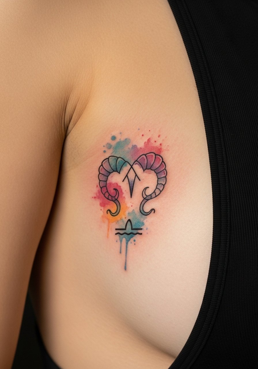 Watercolor looks ethereal for a sign symbol on the ribs. Expect more pain and longer healing—ribs take 2–3 months to fully settle. Colors like pinks and blues may soften over time; black outlines help longevity. Avoid overly diffused edges; ensure the artist plans color saturation to offset eventual fading.