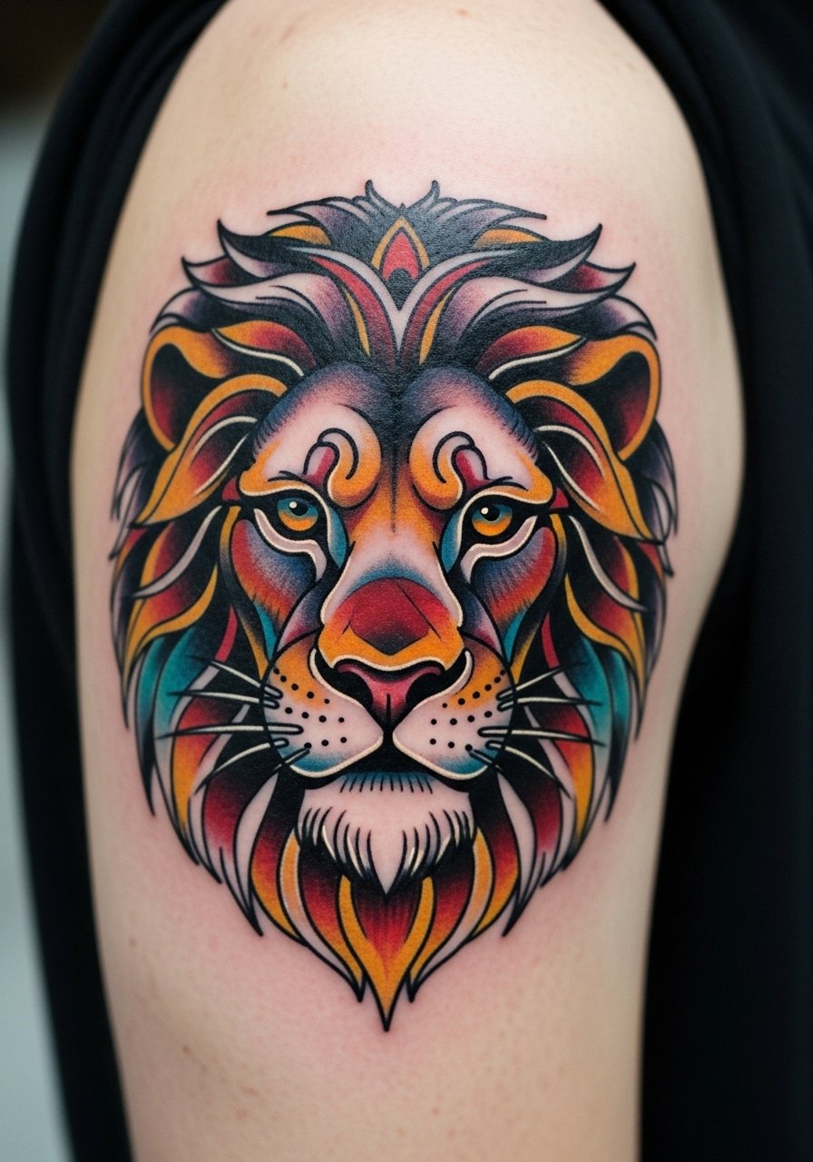 A lion head with color feels classic and confident. Upper arm is low-pain and ages well. Neo-traditional color pops but needs sunlight protection. Artists who balance color saturation and shading will prevent muddying as it heals. Common error: tiny color gradients that lose contrast—ask for clear color blocks.