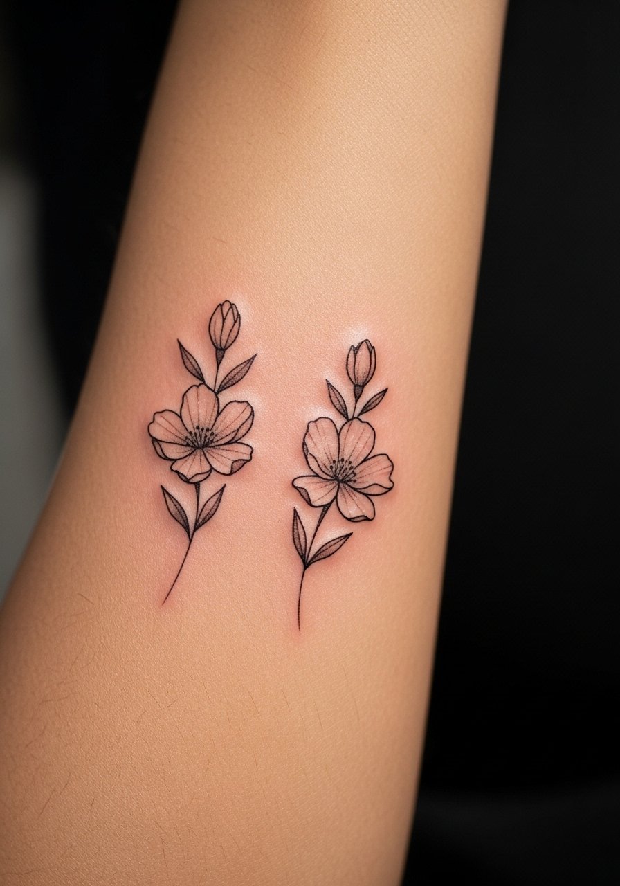 Gemini motifs paired with florals create movement. Inner arm shows detail well but flexes, which can affect healing—avoid heavy detail right over creases. Expect surface healing in 2–3 weeks. Tell your artist you want slightly heavier stems to retain line clarity over time.
