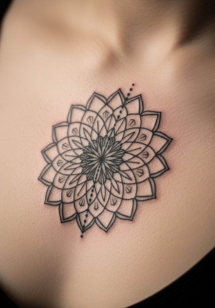 Sternum pieces look striking but hurt. Geometric symmetry demands precise stencil placement—ask for a test fit. Blackwork holds best; avoid tiny interior dots that can bleed. Healing is longer near ribs—expect tenderness for weeks. Artists who specialize in symmetry will produce lasting results.