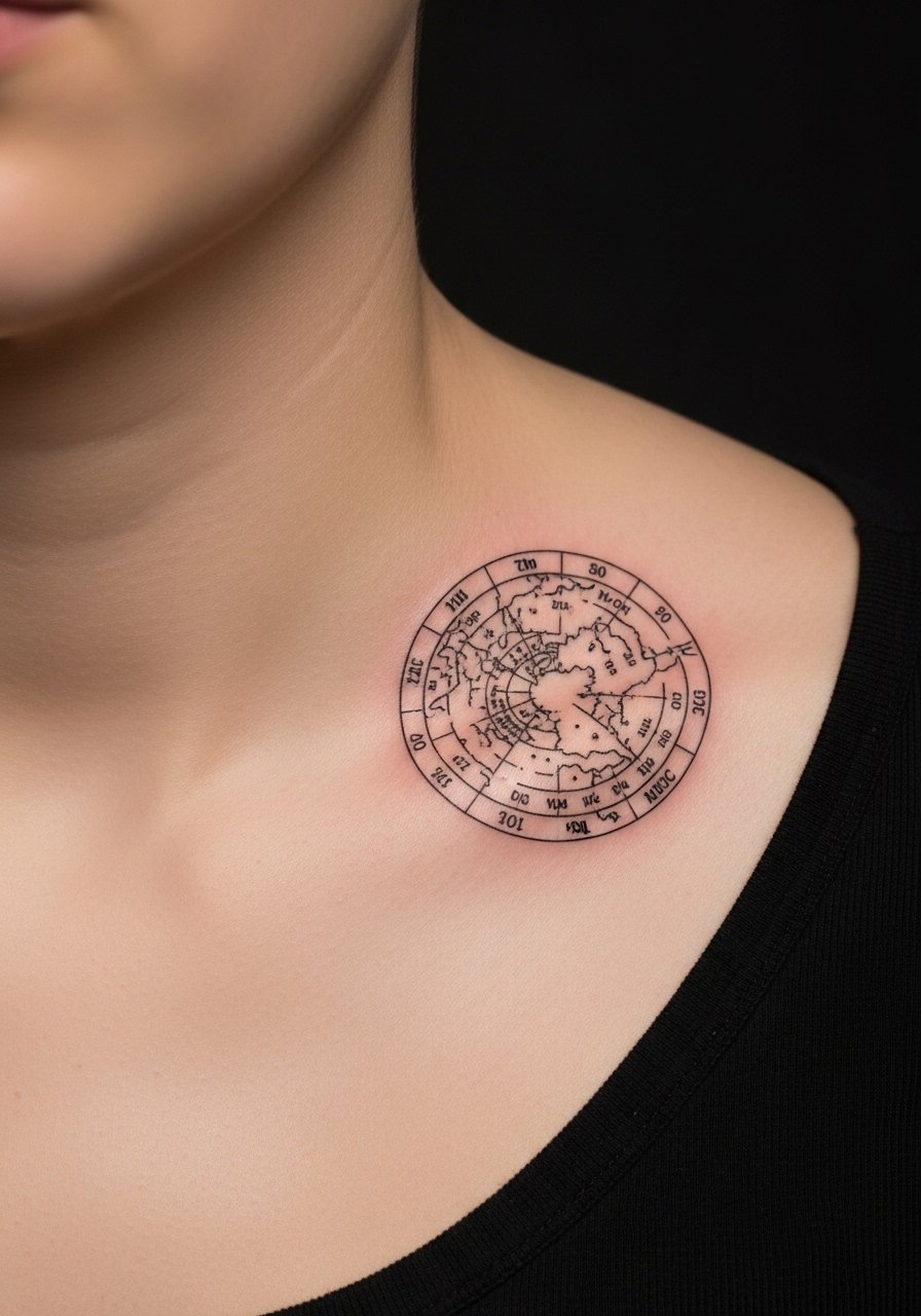 A compact birth-chart layout shows more than your sun sign. Clavicle offers a linear canvas but can be bony—expect some discomfort. Micro-realism here needs an artist who documents healed charts on similar skin tones. This is an under-covered angle: a tattoo that reads like personal data, not a symbol.