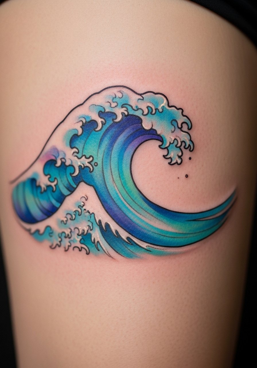 Thighs are forgiving and great for color work. Watercolor here lasts well if you avoid friction from tight clothing during healing. Heals in a few weeks superficially; full settling takes months. Ask for touch-up plans for color refreshes.