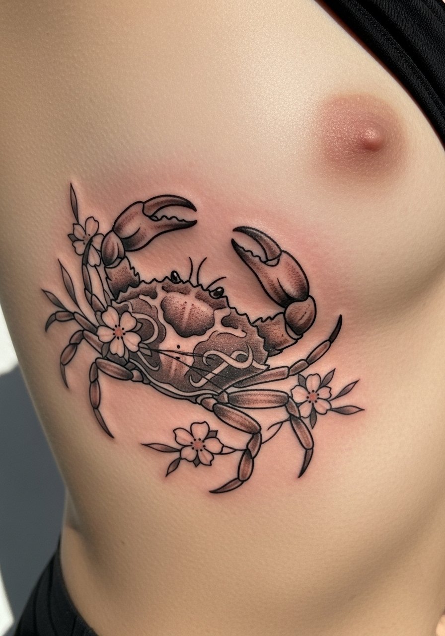 Combining crab symbolism with flora softens the image. Ribs hurt but the piece will look intimate. Floral additions help disguise color shifts as ink ages. Avoid overly tiny insect-like detail that can blur.