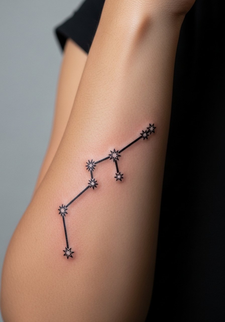A vertical constellation can align with muscle flow. Blackwork connectors keep structure over time. Prevent blur by spacing stars and keeping lines steady. Tell your artist you want healed photos of similar placements.